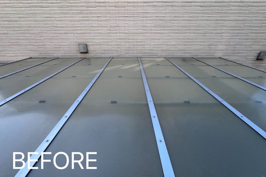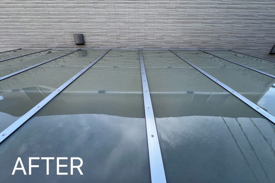もともと大切に住まわれていたお住まいですが、高圧洗浄機による外壁掃除を行うことで、空が映り込むほど、鏡のような美しさへと仕上げました。 細部まで丁寧に洗浄し、建物本来の美しさを引き出しています。